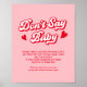 Torne sua celebração especial com nosso Chá de fraldas de Namorados Rosa Não diga Poster de Jogo de Bebê! Perfeito para um jogo de chá de fraldas namorados, é uma adição divertida às ideias do chá de fraldas dos seus dias de os namorados. Apresentando cor-de-rosa e vermelha, ele ajustado perfeitamente a decoração das ideias do chá de fraldas. Quer você esteja planejando ideias de chá de fraldas de fevereiro ou ideias de chás de fraldas queridos, isso é ideal para temas de chá de fraldas 'uma querida está a caminho' e pequenas decorações de ideias de chás de fraldas queridos.