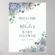 Bem-vindos convidados ao seu chá de fraldas com este belo poster, com suculentos roxos e verdes e verde. Adicione o nome do convidado de honra, a data de chá e o texto de boas-vindas personalizado usando os campos fornecidos.