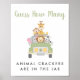 Um sinal de jogo bonito para o seu chá de fraldas com "Adivinhem Quantos Santuários Estão No Jar" escrito numa mistura de uma engraçada escrita verde-selva e uma simples tipografia de cinza e uma ilustração com aquarela de animais do zoológico bebê (leão, elefante, zebra, macaco e girafa) empilhada num veículo safari. Coloque um boião ou garrafa cheia de bolachas de animais por baixo e peça aos seus hóspedes para adivinhar quantos estão no boião. O vencedor será o convidado que se aproximar mais sem passar. Os cartões de palpite correspondentes estão disponíveis na nossa coleção de Chás de fraldas Safari Animal Cute.
