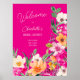 Bem-vindos aos seus hóspedes em estilo com a nossa ilustração Elegante, brilhante e ousada das flores primavera de verão, com bonito e sobredimensionada placa de chá de panela com uma tipografia caligráfica moderna, com néon brilhante, cor-de-rosa, laranja, verde e amarelo, em néon rosa