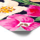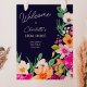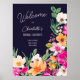 Bem-vindos aos seus hóspedes em estilo com a nossa ilustração Elegante brilhante e ousada das flores primavera de verão, com bonito flor selvagem e símbolo de pincel, com uma tipografia moderna da caligrafia, com flores brilhantes, cor-de-rosa-neon, laranja, verde e amarela, em azul-marinho