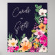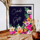 Um sinal de cartas e presentes com a ilustração Elegante, brilhante e ousada, das flores primavera de verão, com bonito símbolo de chá de panela de flores e pincéis selvagens de tamanho enorme, com uma tipografia caligráfica moderna, com néon brilhante, cor-de-rosa, laranja, verde e amarelo, em azul marinho