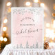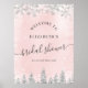 Hora de comemorar seu tema de chá de panela de boas-vindas no inverno com este luxo flocos de neve com brilho prateado faíscas e floresta de pinheiro com relva prateada em um elegante falso pastel festivo pincel de fundo metálico rosa, com uma legal tipografia de fontes moderna.