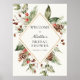 Bem-vindos convidados ao seu chá de panela de inverno com este belo poster, com um quadro de ouro rodeado de verde, poinsetos e verde de inverno. Adicione o nome do convidado de honra, a data de chá e o texto de boas-vindas personalizado usando os campos fornecidos.