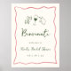 Este belo design de inspiração italiana apresenta uma letra cursiva estilo manuscrito verde, acentuada com uma borda ondulada de fita digitalizadora, rosa. Ilustrações desenhadas à mão de massas alimentícias com arco, vinho e um limão siciliano completam a design de um olhar de verão na costa de Amalfi. Este elegante sinal de boas-vindas do chá de panela mediterrânico apresenta quatro campos de texto personalizados; mostrado com "Benvenuti" (Italiano de boas-vindas) com seu nome e data de evento.