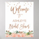 Pôster de boas-vindas para chuveiro de noiva floral cor de pêssego com aquarela, também apresentando algum texto de caligrafia em dourado rosa falso.