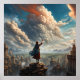 Uma figura solitária se posiciona sobre um afloramento de pedra, olhando para o dramático céu repleto de nuvens torrenciais e uma faixa de luz feroz. A vasta e antiga cidade abaixo, cercada por montanhas, acrescenta um senso de escala e maravilha. A mão estendida da figura sugere uma conexão com o céu, talvez invocando ou comandando as forças da natureza.