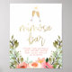 Um sinal de boas-vindas para combinar com o nosso "Chá de panela Dourado Brunch e Bubble". Este design apresenta "bar mimosa" em modernas letras falsas em ouro debaixo de dois copos de champanhe. A mensagem "Pour the bubble, add some sumo, top with fruta & benefit!" está por baixo, acima de um buquê floral de cor d'água. Você pode alterar a mensagem para o texto de sua escolha.