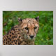 Uma imagem aproximada de um guepardo olhando diretamente para a câmera. O rosto da chita enche o quadro, destacando seu olhar intenso e traços faciais distintos. O fundo é um tom luxuoso de verde, fornecendo um contraste vibrante com o pelo visto do guepardo.