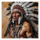 Um chefe nativo americano com uma expressão séria veste uma morada vibrante adornada com penas coloridas. O traje dele é complementado por colares em camadas e criando um olhar impressionante e intrincado.