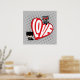 Confira Chibi Catwomen tocando Chibi Batman neste gráfico adorável, apresentando um coração vermelho gigante com a palavra "Amor".
