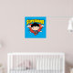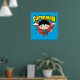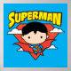 Veja Chibi Superman voando nas nuvens com seu nome super-herói sobrevoando e forma vermelha de escudo de bolinhas atrás dele.