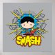 Veja Chibi Superman batendo seu caminho através de uma parede de tijolos com um grande "SMASH"!