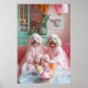 Dois cachorros do Labradoodle, antropomórfico, felizes relaxam num na moda, salão rosa pastel, vestidos com casacos rosados fofinhos. O cenário aestético, aconchegante, é complementado por plantas exuberantes, decoração elegante, e uma bebida refrescante em uma mesa de mármore.
