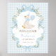 Apresentando um ganso branco de aquarela em um chapéu de festa, delicadas fitas azuis, florais de margarida e padrão de gingham pastel macio, este sinal de boas-vindas é perfeito para uma celebração doce e bobo. O elegante, porém brincalhão, design é ideal para aniversários de primavera, festas de jardim ou qualquer reunião de primeiro aniversário alegre.