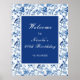 Lindo sinal de boas-vindas de chá de aniversário com pássaros azuis e flores em estilo chinoiserie. Perfeito para um casamento de primavera ou verão. As palavras podem ser alteradas para atender aos seus próprios detalhes ou requisitos.