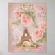 Uma bela colagem de chiques de rosas cor-de-rosa, flores de primavera, ornamentados de espiral e de flores e a Torre Eiffel.