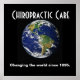 Este simples poster apresenta uma bela imagem da Terra e diz: "Cuidados Quiropráticos: Mudando o mundo desde 1895" Disponível em vários tamanhos, de pequenos e econômicos a impressões gigantescos capazes de criar uma declaração dramática.