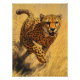 Uma gueparda poderosa cai sobre a savana à velocidade do cheio, capturada numa visão detalhada e próxima. Suas ondulações de casaco, manchadas, com cada poderosa faixa, músculos enrolados e tensos. Os olhos intensos do guepardo são afiados e focados, incorporando o poder bruto de um predador em movimento. Seu corpo está completamente estendido, garras cavando na terra. As gramíneas desfocadas no fundo realçam a forma da chita, iluminada pela luz do sol quente e ouro da savana, acrescentando profundidade e intensidade à cena.