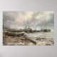 Capture um momento de tensão costeira e charme rústico com essa dramática impressão de arte, feita em um expressivo efeito de aquarela que transmite perfeitamente a atmosfera dinâmica da cena. Um barco à vela de 50 pés, seus dois mastros em pé contra o céu inquieto, está amarrado a um velho e frágil molhe de madeira. O jato em si parece frágil, com os timbres amarrados e vestidos, parecendo que poderia chegar à potência do mar a qualquer momento. O mar é instável, sua superfície viva com movimento, pintada com pincéis de água fluidos que sugerem a força do vento e a agitação da água. Perto, um velho barco a remos, com cerca de 15 metros de comprimento, repousa na costa arenosa, talvez um porto mais seguro, se humilde, das águas turbulentas. Esta trabalho de arte evoca a beleza bruta e os riscos inerentes à vida marítima, contrastando a resistência dos navios com a fragilidade da amarração. Este trabalho de arte apresenta um design único e original, oferecendo uma visão artística distinta. Sua excepcional qualidade e a poderosa representação atmosférica tornam-na uma peça atraente para amantes de paisagens dinâmicas e arte evocativa de aquarela.