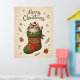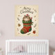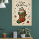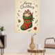 A festive illustration features a cute tabby cat wearing a Santa hat, nestled inside a green and red Christmas stocking. The stocking is decorated with traditional patterns. Above the cat, the words "Merry Christmas" are written in a decorative script. The background is a soft beige color, adorned with stars, dots, and sprigs of greenery.