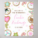 This cute and fun welcome sign features iced cookies with adorable characters such as a snowman, reindeer and Santa Claus. Holly, candy cane and snowflakes add a festive touch. The text combines handwritten script and sans serif fonts for a stylish and modern look. This is perfect for a holiday baking party, cookie decorating party, cookie exchange swap and more.