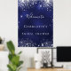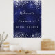 Um cartaz de boas-vindas para uma chuva de presentes. Um fundo azul-marinho com brilhos elegantes de purpurina prateada falsa. A cor azul é irregular. Personalize e adicione um nome. Letras brancas.