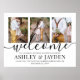 Dê as boas-vindas aos convidados a um chá de panela de casal elegante com um cartaz personalizado de colagem de 3 fotos de 18"x24". As imagens e todo o texto são simples de personalizar. (DICA DE COLOCAÇÃO DE IMAGEM: Uma maneira fácil de centralizar uma foto exatamente como você deseja é cortá-la antes de fazer o upload para o site da Zazzle.) O design moderno minimalista preto e branco apresenta três imagens de sua escolha, caligrafia elegante estilo manuscrito e tipografia vintage elegante. Este sinal de boas-vindas de casamento de casal é uma maneira elegante de compartilhar fotos de noivado como parte das decorações de celebração do seu dia especial. Parabéns à noiva e ao noivo!