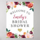 Cartaz de boas-vindas para chá de noiva / casamento apresenta texto elegante emoldurado por uma bela coroa rústica de flores de aquarela de outono, incluindo rosas, dálias, flores de peônia e folhagens, em uma paleta de verão ou outono deslumbrante de vermelho borgonha, amarelo dourado, laranja pêssego, rosa rosado e tons de verde. Inclui um acento de coração dourado. Personalize com o nome da noiva em roteiro vermelho borgonha.