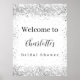 Um pôster de boas-vindas para chá de noiva. Um fundo branco elegante decorado com faíscas de brilho prateado falso. Personalize e adicione um nome. Letras pretas.