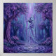 Este cartaz surrealista apresenta uma floresta encantada que se desdobra numa paleta de violeta profundo, lavanda e azul meia-noite, criando uma atmosfera que se sente ao mesmo tempo luxuosa e sobrenatural. Árvores imponentes enquadram a cena como guardiãs elegantes, seus troncos retorcidos e copas densas formando um corredor natural que atrai o olhar para o centro luminoso. No coração da composição, uma figura flutuante misteriosa ergue-se com graça sem esforço, envolta em vestes fluidas e coroada por um chapéu pontiagudo, evocando o encanto da magia, transformação e imaginação indomada. A imagem inteira brilha com uma textura onírica, como se pintada em camadas de luz e sombra. Faixas verticais em cascata no fundo sugerem chuva caindo, energia etérea ou uma cachoeira oculta de cor, adicionando movimento e profundidade à cena. Abaixo, ondulações concêntricas se espalham por uma poça reflexiva, ancorando a fantasia num ponto focal hipnótico e reforçando o sentido de calma, poder e ritual. Este é um mundo que se sente premium, místico e imersivo - uma visualização evocativa construída para capturar a atenção instantaneamente. Sugere descoberta, elegância e um toque do sobrenatural, tornando-o ideal para uma campanha que queira se sentir ousada, cinematográfica e ines