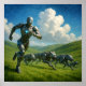 Um ciborgue futurista está correndo por colinas verdes, acompanhado por lobos robóticos. A cena é ambientada contra um pano de fundo de nuvens brancas fofas em um céu azul brilhante.