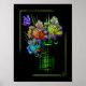 Uma borboleta iridescente toma uma bebida dessas vívidas e fantasiosas flores em um vaso de alta altitude da cidade são ricamente texturizadas para dar a sensação de uma fina pintura de óleo em veludo preto.