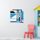 Um abstrato, design geométrico é apresentado em formas de cinza azul brilhante, média e preto sobre fundo branco para um aspecto semelhante a um mosaico; inspirado no estilo design Moderno do século Médio.