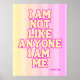"Eu não sou como ninguém que sou eu." Você está procurando por aquela arte de parede única, moderna e bonita, em cores pastéis, para decorar seu quarto, escritório ou qualquer lugar que você queira adicionar um pouco mais de especialidade de sua personalidade? Você fez a escolha certa com esta citação clássica e favorita de Elizabeth Taylor para inspiração e motivação. Por que esperar? Faça-o seu agora!