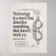 Este trabalho de arte de estilo vintage dos anos 80 combina uma citação de tecnologia clássica com um desenho de patente faux. O texto diz: "Tecnologia é uma palavra que descreve algo que ainda não funciona". Uma ideia de presente de excelente para geeks, codificadores, profissionais de tecnologia e qualquer pessoa que se importe com como a tecnologia muda nossas vidas. Criado por Piotr Kowalczyk & AI © Primeiro publicado: 24.02.2024.