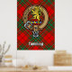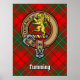 Crachá da crista de Clan Cumming rodeado por uma precinta e fivela sobre fundo de tartã. Custom Text.