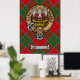 Crachá da crista Clan Drummond rodeado por uma correia e fivela sobre fundo tartano. Custom Text.