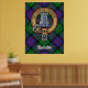 Clan Malcolm or MacCallum crest badge surrounded by a strap and buckle over tartan background. Custom text.