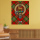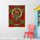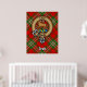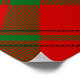 Crachá da crista Clan Scott rodeado por uma correia e fivela sobre fundo vermelho-tartano. Texto personalizado.