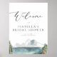 Esta placa de boas-vindas para chá de panela apresenta uma cena de lago em montanha em aquarela com pinheiros e uma fonte de letra elegante. Altere facilmente a *maioria* das palavras para combinar com as necessidades do seu evento.