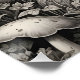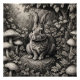 Coelhinho bonito em um jardim de cogumelos com árvores e folhas desenhando.