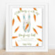 Convites de baby shower neutros em relação ao gênero. Com a frase 'UM COELHINHO ESTÁ A CAMINHO!', uma ilustração de um coelho (rabbit) em aquarela com cenoura nas patas e muitas cenouras laranja. Itens correspondentes disponíveis.