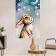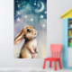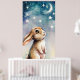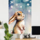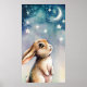 Coelho adorável em aquarelas, uma pintura serena de aquarela de um coelho pequeno e adorável, mirando no céu noturno. Os olhos do coelho são largos com curiosidade e admiração, refletindo as estrelas cintilantes. O fundo é uma bela canvas de estrelas cintilantes, com uma sugestão de lua crescente. As cores são suaves e gentis, criando uma atmosfera tranquila e sonhadora.