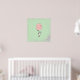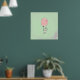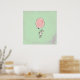 Um pôster com um coelho caprichoso segurando um grande balão rosa flutuando no ar. Definido em um fundo verde claro.