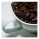 Close-up shot of roasted coffee beans filling a white ceramic cup, with strong lighting and rich textures.
