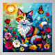 A sweet poster with a cute illustration of a colorful abstract cat surrounded by flowers, butterflies and the sun in a paper quilling impasto style.