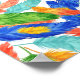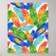 A seamless pattern of watercolor feathers in vivid blue, green, orange, and yellow hues.