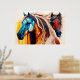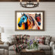 Expressive painting of two horses in vibrant colors! Dynamic brushstrokes in blue, orange, and red create movement and energy. Art perfect for home decor, fabric prints, and art prints. Conveys animal freedom and elegance in a modern and colorful style!