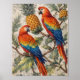 This vibrant tropical bird illustration features two stunning macaw parrots perched among lush foliage and ripe pineapples, creating a rich and lively exotic nature scene. The detailed feathers in brilliant shades of red, orange, yellow, and blue bring the parrots to life, while the surrounding botanical elements add a classic vintage natural history aesthetic.